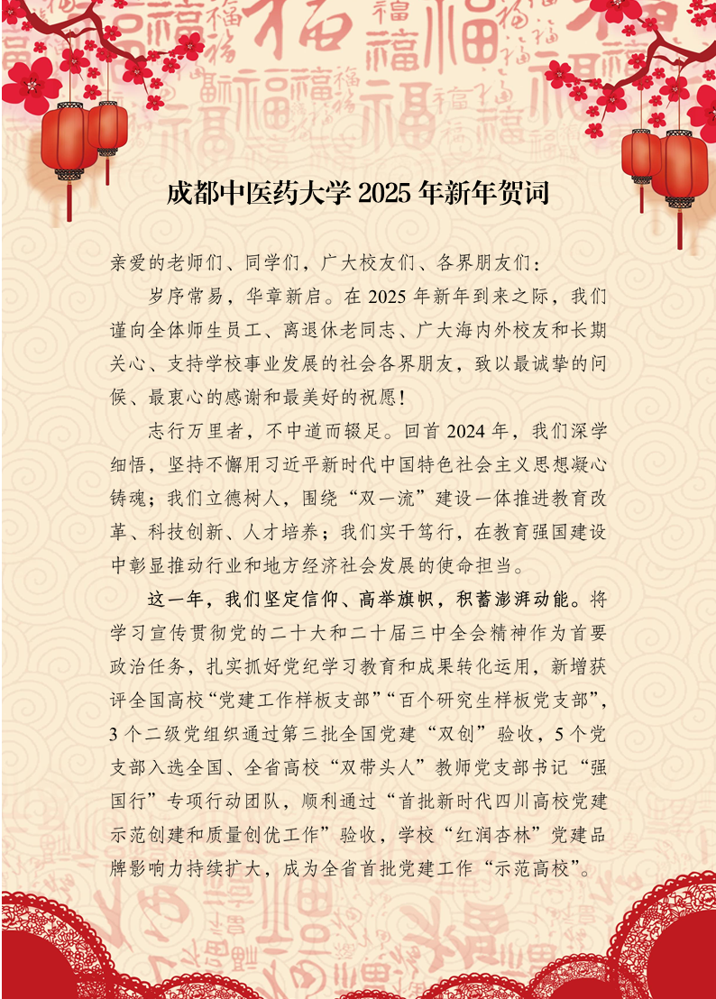 成都中医药大学2025年新年贺词 发布时间:2024-12-31 10:19:55 浏览次数: 次 【字体:小 大】 【打印正文】 上一条:新年新喜讯!我校新增农业科学学科进入ESI全球排名前1% 下一条:数启新智,携创未来