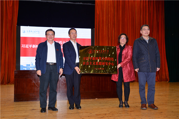 10月27日,“成都中医药大学习近平新时代中国特色社会主义思想研究中心”授牌仪式在温江校区百会堂举行,刘毅、余曙光为中心授牌,马克思主义学院院长刘东梅、党委书记杨支才接牌。